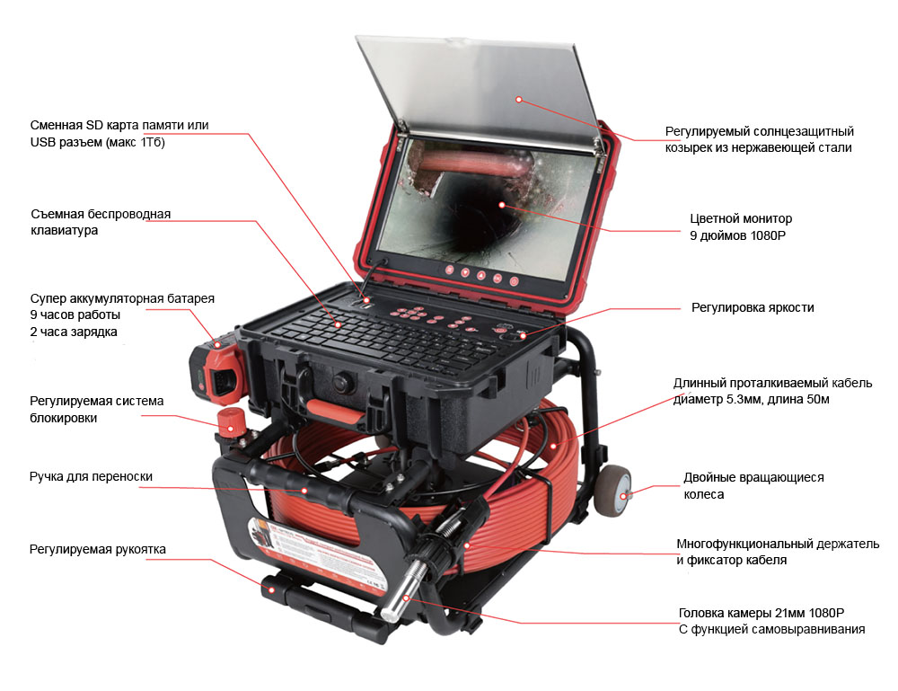 Эта телеинспекционная система с HD головкой камеры оснащена высококачественными сведодиодами и предназначена для осмотра труб в режиме реального времени. Подходит для трубопроводов, канализационных систем, стоков, воздуховодов, дымоходов, сантехники, зданий, бассейнов, пищевых трубопроводов, водопроводов, кабельных труб, систем центрального кондиционирования и вентиляции, а также для других объектов и систем, связанных с сантехникой, и многих других, где требуется с помощью светодиодов подсветки инспекция и контроль труб.