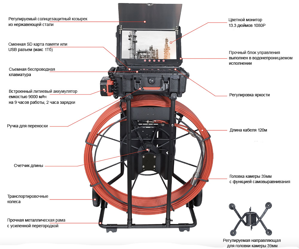 Эта телеинспекционная система с HD головкой камеры оснащена высококачественными сведодиодами и предназначена для осмотра труб в режиме реального времени. Подходит для трубопроводов, канализационных систем, стоков, воздуховодов, дымоходов, сантехники, зданий, бассейнов, пищевых трубопроводов, водопроводов, кабельных труб, систем центрального кондиционирования и вентиляции, а также для других объектов и систем, связанных с сантехникой, и многих других, где требуется с помощью светодиодов подсветки инспекция и контроль труб.